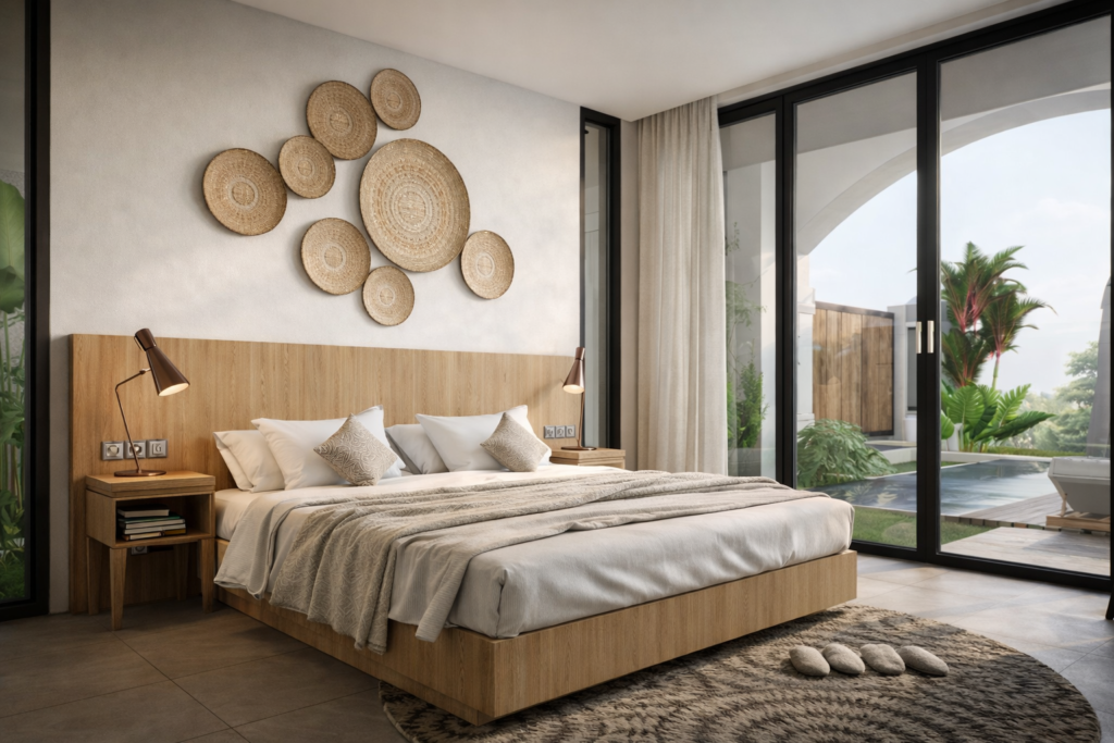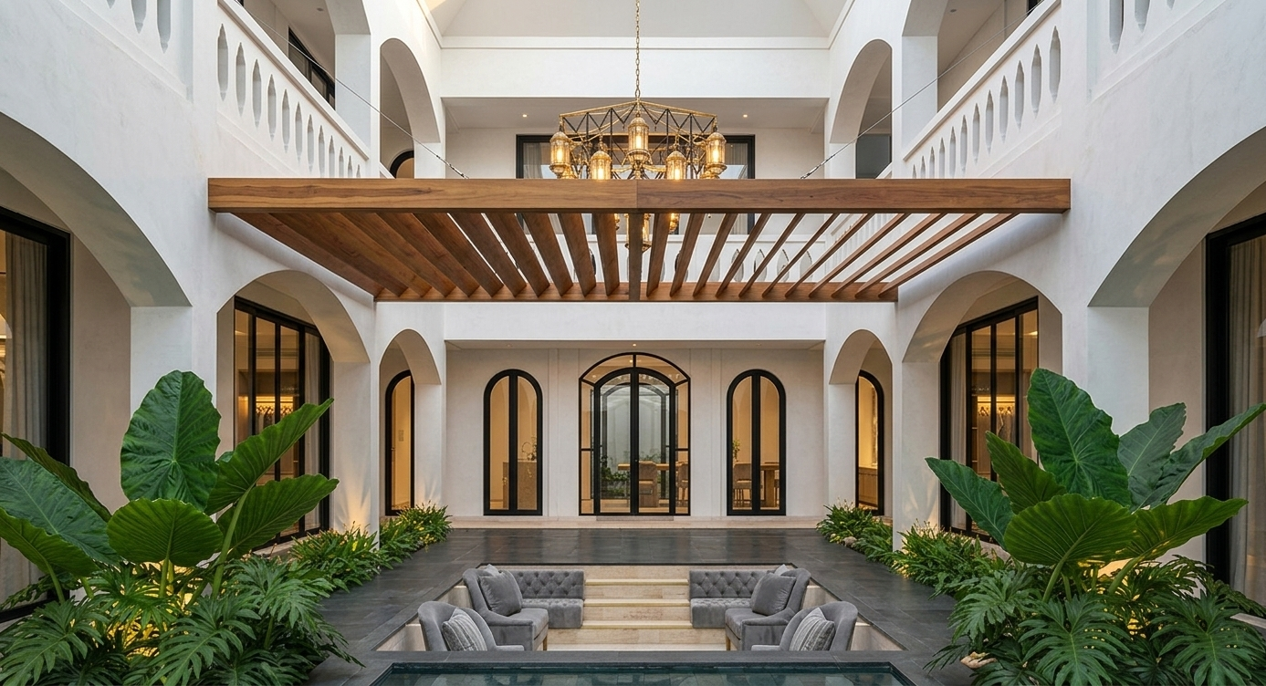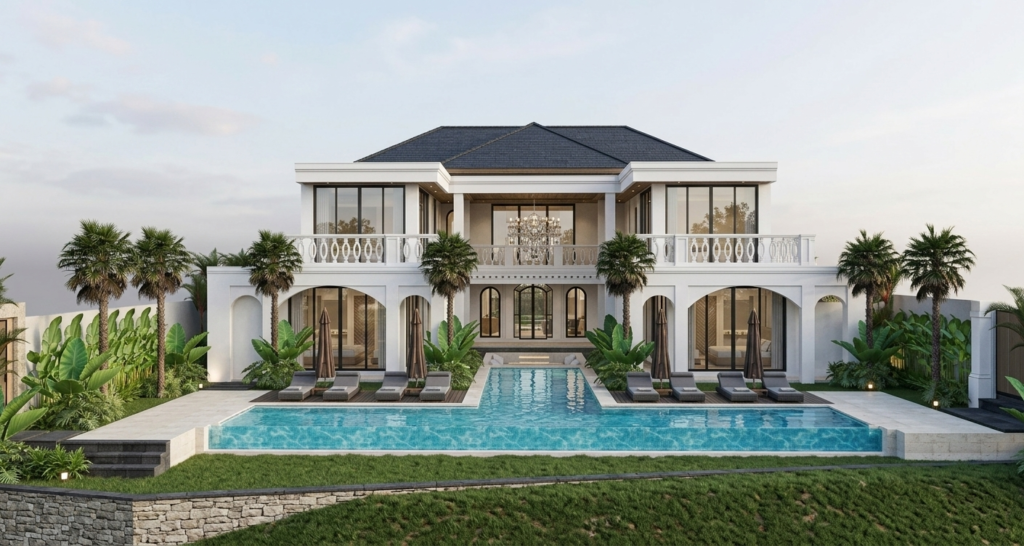 Surrounded by tropical landscaping, the villa balances European architectural character with the serenity of its natural setting. Palm-lined gardens and reflective water elements frame the building, reinforcing the resort-like atmosphere of the property. The result is a residence that blends classical inspiration with contemporary living, offering a refined sanctuary designed for both elegance and tranquility.